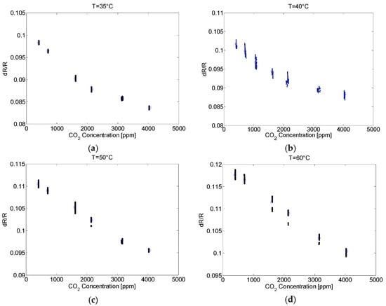 Printed sensor response in terms of relative variation of the output resistance for increasing values of the CO2 concentration, for different values of the operating temperature: (a) 35 °C, (b) 40 °C, (c) 50 °C and (d) 60 °C. Vertical dots state for the dispersion of repeated observations of the sensor response; the circles are the mean values of repeated observations.