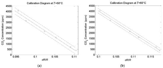 The calibration diagrams for two operating temperatures: (a) 50 °C and (b) 60 °C. The uncertainty bands are represented by the dotted lines.