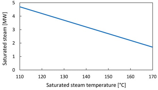 Maximum amount of saturated steam that can be generated by heat recovery from the cooler exhaust air as function of the saturated steam temperature, considering a minimum approach temperature of 80 °C.