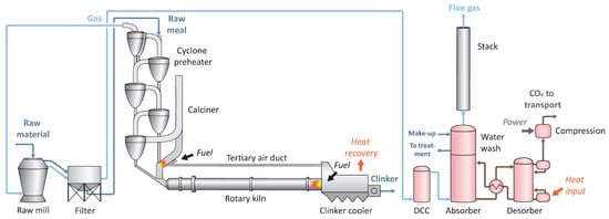 Production of cement is estimated to account for around 7% of global CO2 emissions (2018) [1]. The cement industry can reduce its specific CO2 emissions through a variety of different techniques, such as increased energy efficiency, utilization of alternative fuels, application of alternative raw materials, and reduction of the clinker to cement ratio. However, these techniques have already been exploited to a significant extent, and they can only partly reduce the emissions [2]. Around two-thirds of the CO2 emissions from the cement industry are process related, originating from the calcination of limestone where CaCO3 is converted to CaO and CO2, while one-third of the emissions come from combustion of fuels in the cement plant’s calciner and rotary kiln. A measure such as fuel switch can therefore only remove one-third of the CO2 emissions. CO2 capture and storage (CCS) can significantly reduce both the process related and fuel related emissions. It is identified as the single measure that has the largest potential for further overall emission reductions in the cement industry [1,2].