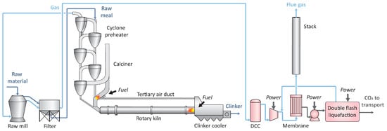 Reference clinker burning line with membrane-assisted CO2 liquefaction.