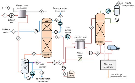 The reference technology MEA absorption is a post-combustion technology, where CO2 is absorbed from the flue gas with MEA solvent (Figure 3). To limit solvent degradation, the content of NOx and SOx in the flue gas must be reduced beyond the permitted emission limits before the flue gas comes in contact with the solvent. The already existing SNCR system is assumed to be utilized to remove additional NOx before the flue gas leaves the kiln. This flue gas is then cooled in a direct contact cooler (DCC) where water also is removed, and SOx is removed by scrubbing with NaOH. The cooled flue gas can then be sent to the absorber column where aqueous MEA solution (30 wt %) absorbs CO2 from the gas. Evaporated MEA is recovered from the purified flue gas in a water wash section at the top of the absorber. The CO2 rich MEA solvent is regenerated in a desorber column, and the resulting high-purity CO2 is compressed to reach the transport specifications.