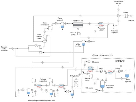 The flue gas entering the process is first cooled and water is removed in a DCC, before it is compressed and sent to the membrane module. The pressure difference and pressure ratio over the membrane module is generated both by the flue gas compression on the feed side and vacuum pumps on the permeate side of the membrane. The chemical stability of polymeric membranes depends on the type of polymer, and the tolerance of such membranes to SOx and NOx is often highlighted as uncertain [17]. However, some membrane producers report on high tolerances for their membranes [18]. In this work, the same strategy for SOx and NOx removal prior to the capture system as for MEA absorption is assumed.