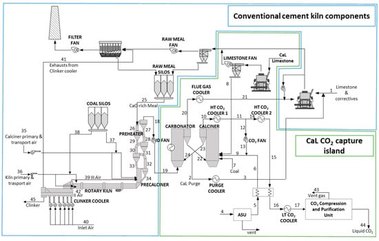 Reference clinker burning line with calcium looping CO2 capture—tail-end configuration.