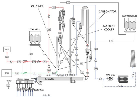 Reference clinker burning line with calcium looping CO2 capture—integrated configuration.