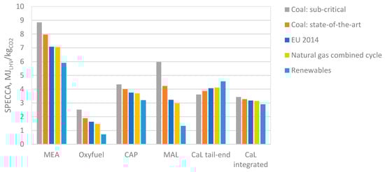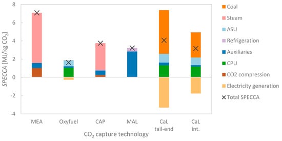 The specific primary energy consumption for CO2 avoided, SPECCA, evaluates the primary energy used to avoid CO2 emissions to the atmosphere. It is defined as the difference in equivalent primary energy consumption of the cement plant with and without CO2 capture, divided by the difference in equivalent CO2 emissions without and with capture