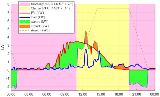 The emissions arbitrage operating algorithm designed for this study takes as input the time series described in Section 3.2. Only generator dispatch up to 5 min previously is knowable, from which is easily calculated from the previous month’s dispatch data using the regression method of Section 3.2. The Supplementary Movie File ‘algorithm_movie.mp4’ explains the algorithm (still frames in Appendix A). The battery is set to discharge at rate until it is empty while the instantaneous is above a given limit , and to charge at until it is full while instantaneous is below limit . When discharging, any excess power from both PV and battery above the load is exported (in Figure 2: 00:00–01:00, 05:40–10:55, 19:45–22:55), or if they are not enough, any remainder is imported to serve the load (01:00–05:40, 22:55–00:00). When charging, any excess PV power not used by the battery or load is exported (10:55–16:50 except 12:10–12:40 and 13:40–14:30), or if insufficient, power is imported from the grid to charge the battery (12:10–12:40, 13:40–14:30, 16:50–19:45). The limits and are continuously updated, set respectively at 0.02 kg/kWh below and above the mean of the previous 30 days’ . In other words, the deadband is 0.04 kg/kWh.