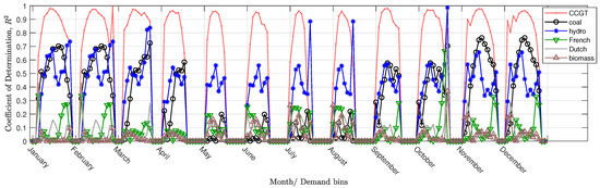 Figure 3 shows the goodness of fit for the linear regressions of against binned by month and demand , for each generator type j. is typical for CCGT, indicating a close correlation between changes in demand and changes in CCGT power in response. Exceptions occur in very low- and high-demand bins where there is little data. Especially in the summer months, GW typically, so there is no data at all in higher bins. A moderately good fit ( = 0.5 to 0.8) is obtained for coal power response in winter. The poor correlation in summer is likely due to most coal plants outputting very low or zero power, so that they cannot ramp down further in response to decreasing . The goodness of fit is similar for hydroelectric power but throughout the year. Biomass and French and Dutch interconnectors responses are poorly correlated with changes in demand. They contribute little power (1–2 GW each to a demand ranging around 20–50 GW) and are unlikely to greatly distort the CO2 results. They are included for completeness.