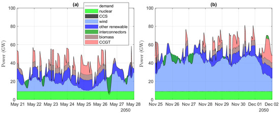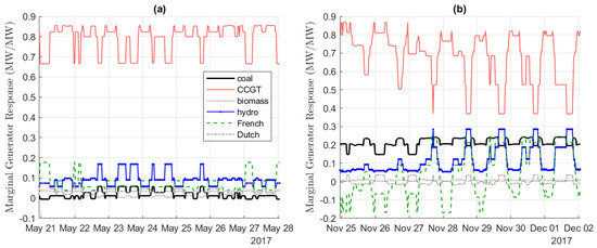 of coal, CCGT, biomass, hydroelectric, and French and Dutch interconnectors, for (a) 21–28 May 2017, and (b) 25 November–2 December 2017.