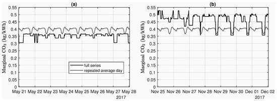 Figure 5 shows for the same time periods as Figure 4 the results of applying CO2 intensities for each generator type to the series and summing them together. Variation can be between 0.35 and 0.5 kg/kWh in winter. Taking the average across the whole year of the in each half-hour period of the day results in the average day’s , also shown in Figure 5. It varies <10% away from the mean 0.398 kg/kWh, because the patterns of low and high vary from day to day. This is consistent with the prediction by LCP/EnAppSys (2014) [30] that in the next few years the daily variation in would reduce to close to zero, and appears to justify the use of a single value of in CO2 abatement studies. As seen from Figure 5, however, the average day’s masks the variation that is present on other days.