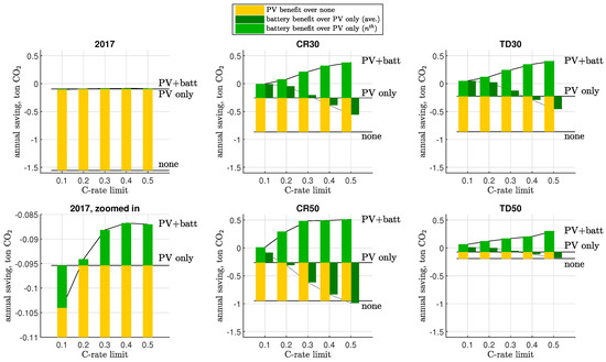 Annual CO2 saving (tons) for varying C-rate limit, in 2017 and future scenarios, for average and nth systems. Savings are demarcated as benefit of PV only compared to no PV and no battery (‘none’), and benefit of PV and battery above PV only. Zero CO2 saved denotes carbon-neutrality for the household.