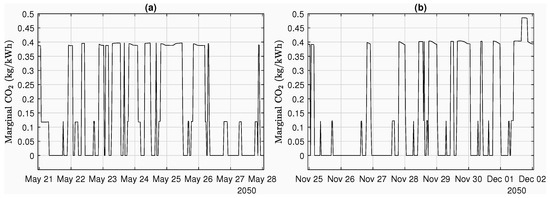 Finally, it would be valuable to conduct financial analyses of the PV-battery system running the emissions arbitrage algorithm. Such information, together with visualizations like those in Figure 9, can help a customer choose the PV-battery capacities combination to maximize CO2 savings within the constraints of their initial investment. This would depend on the customer’s household load profile, and so it would be valuable to analyze the effects of above- and below-average consumption. A lower net present value and/or internal rate of return, or longer payback period compared to a PV-only system may be tolerated by some particularly environmentally conscious consumers. However, a change in policy may be necessary to align the environmental and financial incentives, for example, linking a subsidy to kg CO2 (or other emissions) saved. With smart meters and home batteries themselves commonly recording data at 15-min resolution or better, the only issues would be a need to standardize the calculation of and the verification of each household’s emissions savings in a way that respects data privacy. Another possibility is for energy suppliers to offer a time-of-use tariff dependent on . Considering Wadebridge Renewable Energy Network’s Sunshine tariff trial (https://wren.uk.com/sunshine) and Green Energy UK’s Tide tariff (https://www.greenenergyuk.com/tide), this is already an idea with commercial applications.