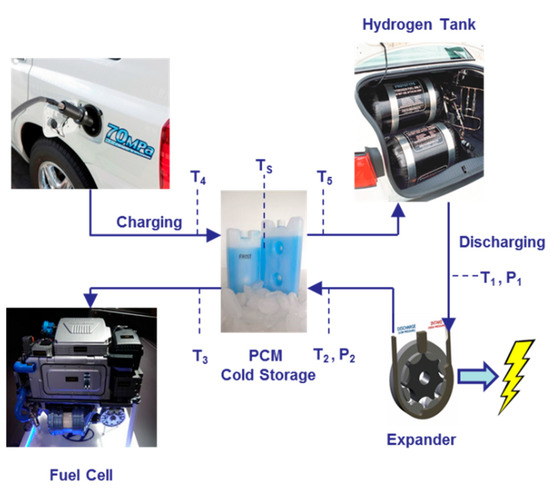 Figure 1 shows the configuration of the pressure energy recovery system. During the driving cycle, hydrogen pressure from the tank to the fuel cell is reduced to less than 1 MPa typically by a pressure regulator; for the proposed system, an expander is used from P1 to P2 to produce additional power. During expansion, hydrogen temperature drops from T1 to T2; furthermore, the cold hydrogen from the expander passes through an on-board CTES system, freezing the phase change material (PCM). As shown in Figure 2, the temperature of expanded hydrogen increases from T2 to T3 through the CTES system, whereas in the PCM, phase change occurs at a constant temperature TS. Then, during the next filling process, the CTES system is used to cool the high-pressure hydrogen gas from T4 to T5 before filling, reducing (or eliminating) the energy consumption of the chiller at the fueling station.
