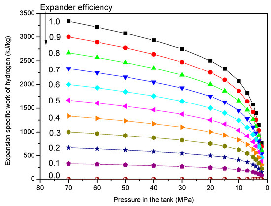 Figure 3 shows the expansion work of hydrogen in the vehicle tank for various expander efficiencies with respect to pressure. It was assumed above that hydrogen from the tank expands to 1 MPa through the expander. For a given expander efficiency, the expansion work decreases with a decrease in tank pressure. Correspondingly, for a given tank pressure, the expansion work is proportional to the expander efficiency.
