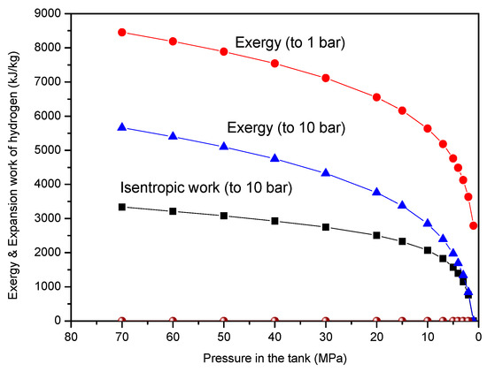 Figure 4 shows the exergy and isentropic expansion work of hydrogen. The exergy difference between the given tank pressure and the final pressure of 1 MPa, as the maximum available work from the expansion process, represents the ideal expansion work by an isothermal expansion. As shown in the figure, the ideal adiabatic (i.e., isentropic) expansion work is equal to about 60–70% of the exergy difference.
