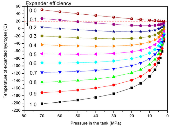 The maximum temperature drop by isentropic expansion (1.0 expander efficiency) from 70 MPa to 1 MPa is −201.6 °C. For a given pressure in the tank, the temperature drop is proportional to the expander efficiency. Similar to the characteristics of the expansion work, for a given expander efficiency, the temperature drop decreases with a decrease in tank pressure.
