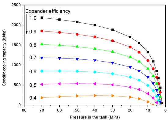 Because the expansion work and cooling capacity of the expanding hydrogen decreases during the discharging period from 70 MPa to 1 MPa, calculating the mean values of the expanding hydrogen expanding hydrogen is useful. Figure 6 shows the specific cooling capacity of the expanded hydrogen for various expander efficiencies with respect to the tank pressure.