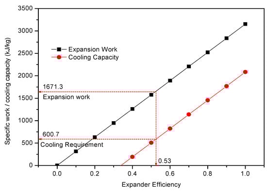 Figure 7 shows the mean expansion work and cooling capacity of hydrogen with respect to expander efficiency. At an expander efficiency of 0.53, the expansion work is 1671.3 kJ/kg. In order to replace the use of the chiller at the fueling station, the minimum cooling requirement from 20 °C to −20 °C at 70 MPa, neglecting the loss of the CTES system, is 600.7 kJ/kg.
