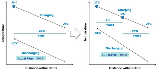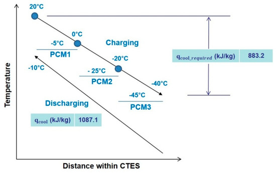 As pre-cooling temperature, T2 was initially assumed to be −20 °C. To achieve the lower temperature of −40 °C, the three stages of PCM (−5 °C PCM1, −25 °C PCM2, and −45 °C PCM3), shown in Figure 10, can be used. In doing so, the cooling capacity (1087.1 kJ/kg) is able to meet the minimum cooling requirement (883.2 kJ/kg) from 20 °C to −40 °C at 70 MPa, as in the previous calculation process.