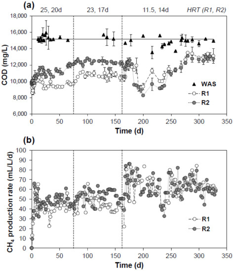 The chemical oxygen demand (COD) (a) and CH4 production rate (b) profiles of the WAS bioreactors.