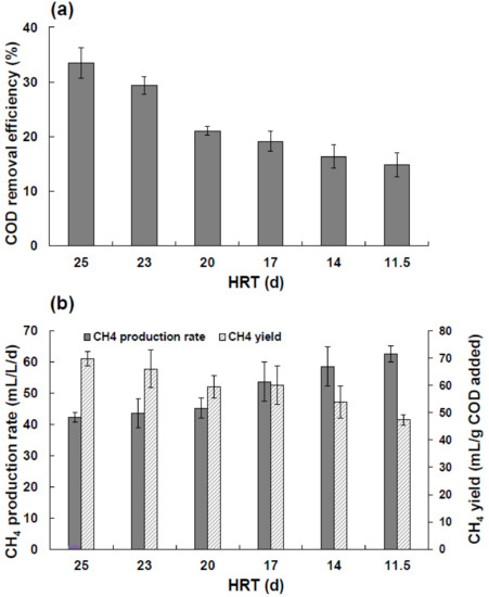 The COD removal efficiency (a) and CH4 production rate and yield (b) at the steady states.