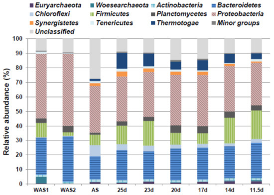The dominance of Proteobacteria in activated sludge processes has been reported [43]. This result implies that the abundance of Proteobacteria in the sludge digesters might be linked to its high concentration in the influent. This possibility is supported by the higher abundance of Proteobacteria in the WAS (46.9 ± 3.6%) than in the bioreactors (32.0 ± 2.3%) (Figure 3). While the top three phyla (proteobacteria, bacteroidetes, and firmicutes) were not statistically (p < 0.05) more abundant in the WAS than in the bioreactors, or vice versa, the levels of Euryarchaeota, Chloroflexi, Synergistetes, and Thermotogae were significantly (p < 0.05) higher in the bioreactors than in the WAS (Figure 3).