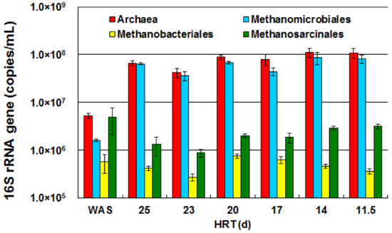 Due to the low relative abundance of the methanogenic taxa (Euryarchaeota) (Figure 3), real-time PCR was additionally performed for the domain Archaea and the methanogen groups Methanobacteriales, Methanomicrobiales, Methanosarcinales, and Methanococcales to quantify the methanogen communities. The Methanobacteriales, Methanomicrobiales, and Methanosarcinales primer-probe sets successfully amplified their target taxa (Figure 4). The results showed that the bioreactors (4.3–11.1 × 107 copies/mL) had one order of magnitude higher levels of Archaea than the WAS (5.3 × 106 copies/mL). Among the methanogen orders, Methanomicrobiales (6.3 ± 2.0 × 107 copies/mL) was dominant (25 times higher than the sum of others) in the bioreactor samples, whereas Methanosarcinales (4.9 ± 2.8 × 106 copies/mL) was the most abundant (three times higher than the sum of the others) in the WAS.