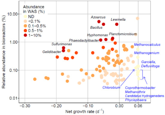 The net growth rates (Equation (1)) of the identified microbial taxa were analyzed to estimate how immigrant microbes affected the microbial community in the anaerobic bioreactors. The number of microorganisms was estimated by multiplying the average VS value of the corresponding sample (i.e., WAS or bioreactor at the steady states) by the proportion of the taxa at the genus level. The two WAS samples were averaged in this calculation. The mean estimated net growth rates for the six HRT conditions were plotted (Figure 5), along with their mean relative abundance in the bioreactors.