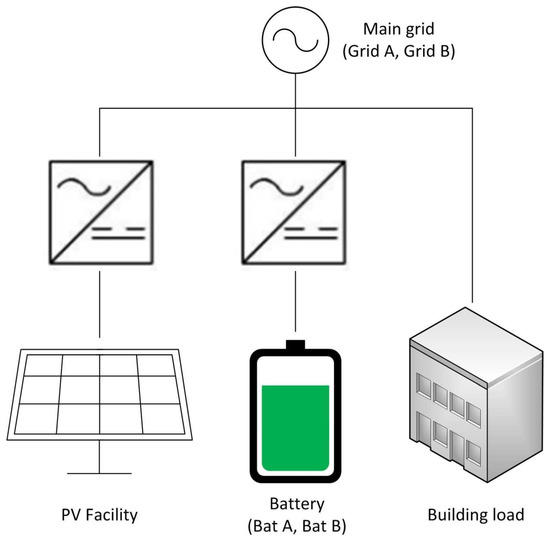The proposed method is designed to optimally use an energy storage system on a microgrid with a load and generation system connected to the distribution grid. For the rest of this document, a battery and a PV facility will be assumed to play the energy storage and generation systems, as those were employed during the tests. Figure 1 shows the model of the microgrid.