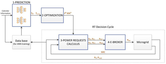 Every 15 min, the PLC reports the average PV power production, load consumption, and battery SOC for that time period. This information is stored in a data base to train the ANNs, as well as to evaluate the results of the proposed method.
