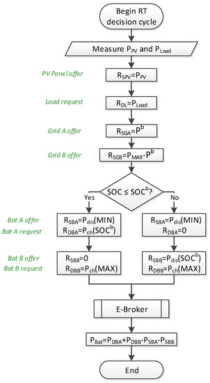 The actual power generated by the PV facility PPV and the power consumed by the load PLoad are measured. A power request is made on behalf of each one (RSPV and RDL) to provide or receive the same power they are respectively generating or consuming. These two devices are not actually requesting permission to produce or consume such power; they will do it anyway as they are not controlled. Thus, to ensure the E-Broker auction algorithm always serves these requests, they will be given the highest priority.