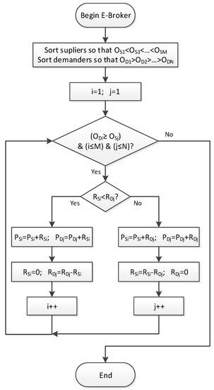 Devices are checked in priority order and each demander is searched for a supplier with equal or lower priority that has power available to feed it. This way, the algorithm calculates the power each supplier must provide PS1…PSM and each demander must receive PD1…PDN, having a balance between the total power delivered and received. Figure 4 summarizes the E-Broker Auction Algorithm.
