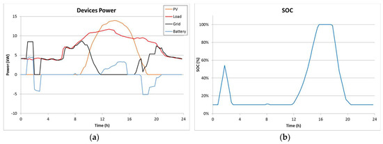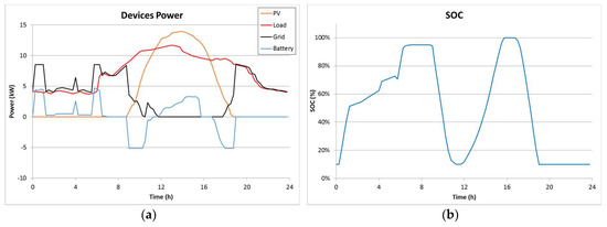 Simulations results for the state-of-the-art method: (a) Devices power; (b) Battery SOC.