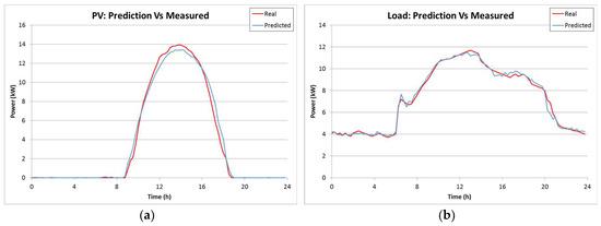 Figure 9 shows the predicted and real power values for the PV facility and load respectively. As previously stated, these predictions were obtained using artificial neural networks whose input solely consists of calendar information.