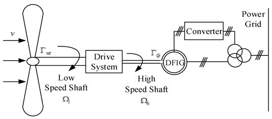 The WECS is mainly composed of wind turbine, transmission system, generator, AC-DC converter, power grid and so on. Wind turbines convert the captured wind energy into mechanical energy, drive the doubly-fed induction motor to rotate through the transmission link, and transmit the generated energy to the power grid [21]. The DFIG-based WECS is shown in Figure 1.