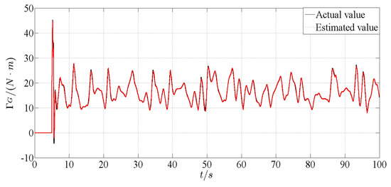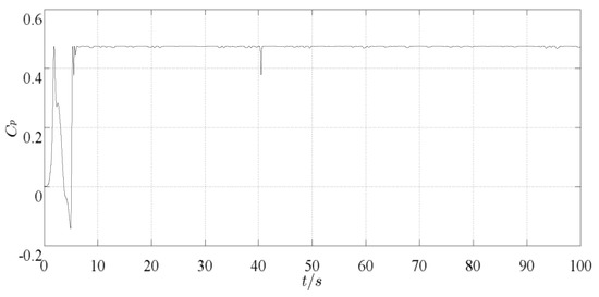 It can be seen that Figure 3 is a comparison of the estimated and actual values of the speed of the high-speed shaft speed when the system is fault-free. Figure 4 is a comparison of the estimated and actual values of the electromagnetic torque. As shown in Figure 3 and Figure 4, the sliding mode observer designed in this paper can quickly follow the original state of the system, and the effect of state estimation is satisfactory. The reference value of electromagnetic torque is shown in Figure 5, and the wind energy conversion coefficient Cp can reach the ideal maximum, which can be kept at about 0.476 in 5~100 s, as shown in Figure 6.