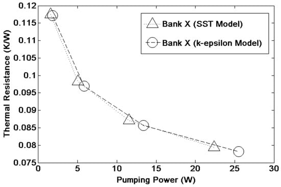 R Fluent has thus provided options for overcoming this shortcoming in these models by having an option of “Enhanced Wall Treatment” in the Near-Wall Treatment option with further selections of the pressure gradient effects and thermal effects in the near-wall region along with viscous heating. If the near-wall mesh is fine enough to address the laminar sublayer, then this method is quite similar to how the solver treats the turbulent modeling in the near-wall region in the k-ѡ SST model. Through this manipulation, contact sizings of the fins and the base tube region were added so that the mesh refinement is done carefully. The advantage of using this wall-enhanced treatment for the k-ϵ model is that the resultant model has lower computational requirements, which is considered to be advantageous in a number of practical engineering applications. A comparison of the results in terms of thermal resistance versus pumping power using the realizable k-ϵ model with enhanced wall treatment and the k-ѡ SST model is shown in