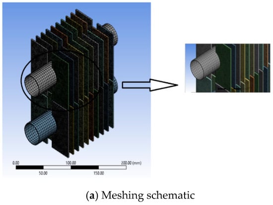 The mesh is created in ANSYS Workbench using the inbuilt meshing feature in the Fluid Flow (Fluent) solver. The mesh for Bank X contains 3,458,898 elements with around 600,000 nodes. The advanced sizing functions are used over both proximity and curvature with high smoothing and slow transition. Eighty contact sizings of 2 mm each for the fin and base tube-contact regions are also used. The mesh is more structured over the fin surfaces and unstructured over the contact regions. The average orthogonal quality for the mesh elements is 0.89 with a standard deviation of less than 0.09. The typical mesh for the fin and tube surfaces for Bank X with a zoom in is shown in