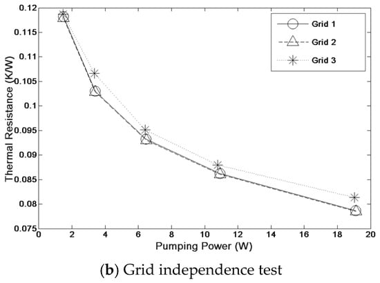 Figure 4b in a graph in terms of thermal resistance vs. pumping power. Apart from the grid-independency test, the numerical results were compared with the experimental data from Chen et al. [