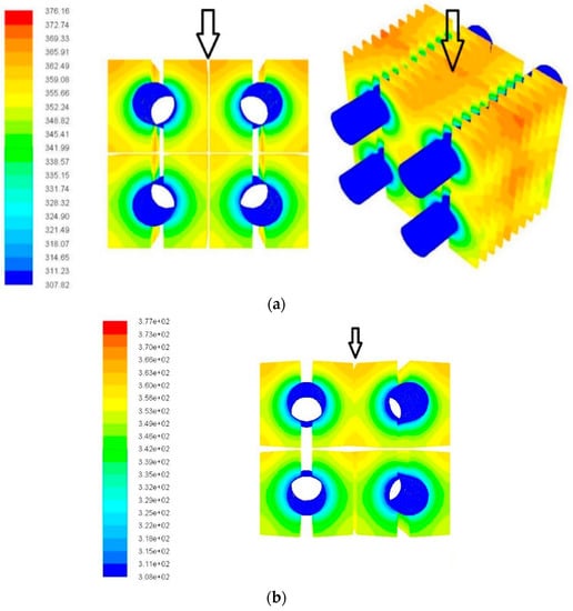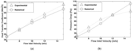 Figure 5a,b. The simulations are in line with the experimental results with 6% difference in predictive heat transfer coefficient (h) and the measurements, while being within 20% for the pressure drop (ΔP). The verification of the present simulation against the experimental results substantiates the applicability of the present simulations.