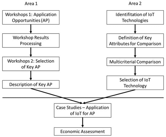 The basic data obtained for this article primarily comes from an extensive survey among experts in the Czech energy industry. This survey was conducted among fifty experts from a variety of businesses as well as the academic sphere in the 2016/2017 winter season. To obtain the relevant data, a total of 77 workshops were held; these took place in two rounds, see Figure 3 (Area 1). Alongside the workshops, selection and comparison of available IoT technologies (Figure 3, Area 2) on the Czech market was also performed. The selected technologies were then utilized during the formulation of the case studies.