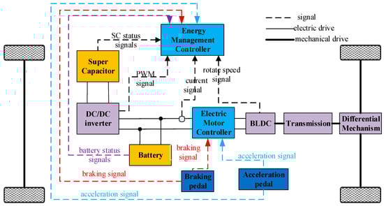 The vehicle is equipped with a brushless direct current motor (BLDC) connected to a fixed-ratio transmission. BLDC is powered by battery and SC. The bidirectional DC/DC converter is used to interface the SC with the BLDC. Energy management controller plays the role of power split in the hybrid power system. The architecture of the hybrid power system is as shown in Figure 1. The main parameters of the EV used in this study are listed in Table 1.
