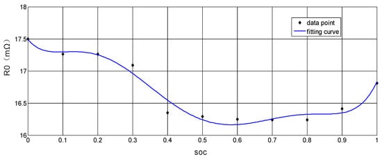 The parameter data of variables is obtained through battery characteristics experiments, and the calculation results of the battery module internal resistance are shown in Table 3. According to the calculation results of the internal resistance of the battery module in Table 3, the relationship between battery SOC and internal resistance can be obtained by polynomial fitting under MATLAB environment (The MathWorks, Inc, Natick, MA, USA), and 6 times polynomial is obtained, such as Equation (1).