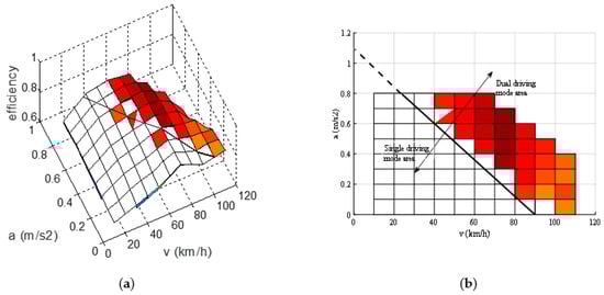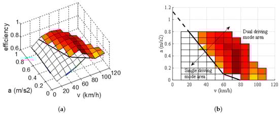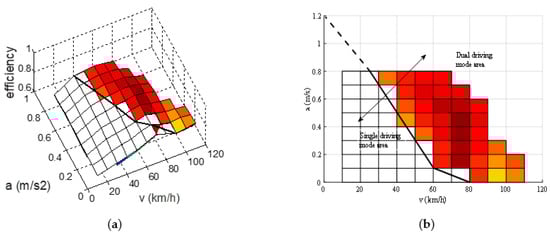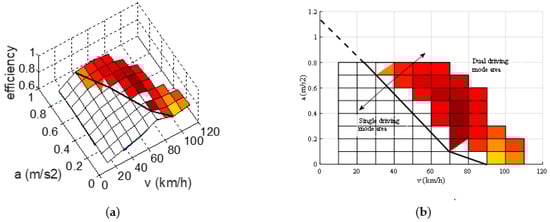 As the Figure 7 shows (similar to Figure 8, Figure 9 and Figure 10), the white mesh stands for the efficiency in single driving mode; the colorful one stands for the dual driving mode; meanwhile the switching rule of single driving mode and dual driving mode under Condition 1 can be summarized. It can be seen from Figure 7a (similar to Figure 8a, Figure 9a and Figure 10a) that the efficiency of single driving mode is higher than that of dual driving mode when the speed and acceleration are smaller, and the power system should work in single driving mode at this time. With the increase of the vehicle speed and acceleration, the efficiency of dual driving mode increases slowly and is larger than that of single driving mode, and the power system should work in dual driving mode at this time. In order to accurately find out the switching rules of single driving mode and dual driving mode in power system, the three-dimensional surface graph shown in Figure 7a (similar to Figure 8a, Figure 9a and Figure 10a) is projected to the v-a plane, and the efficiency differentiation curve of single driving mode and dual driving mode can be obtained in Figure 7b (similar to Figure 8b, Figure 9b and Figure 10b). The dividing line between white grid and color grid is the switching rule of single driving mode and dual driving mode: when the speed and acceleration are located at the lower left of the dividing line, the efficiency of single driving mode is higher and the power system should switch to single driving mode; when the speed and acceleration are at the upper right of the dividing line, the efficiency of dual driving mode is higher and the power system switches to dual driving mode.