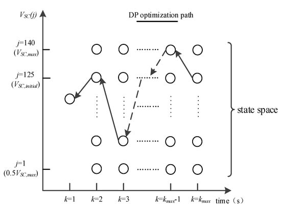 The DP algorithm adopted in this paper takes the SC terminal voltage of as the initial state variable and discretizes it into 140 states from 0.5VSC,max to VSC,max, as shown in Figure 12. The DP algorithm first carries on the reverse calculation. After the SOC of the battery and the terminal voltage of the SC are given, the optimal decision results of each stage are obtained by the reverse calculation according to the terminal conditions k = kmax. Taking the decision variables of k time u(k), ui(k) as an example, the state of k+1 time x(k+1), xi(k+1) can be obtained according to the system state variables of k-time. Because x(k+1), xi(k+1) is not necessarily the state value at k + 1 time, the energy loss of composite power system corresponding to state x(k+1), xi(k+1) is obtained by interpolation method. The energy loss value of the composite power system with state variables u(k), ui(k) at k time is f(k), fi(k). The output power of the SC corresponding to the smaller one is taken as the optimal decision variable in this stage. All other stages are the same until all stages are reversed. At the end of the reverse recursion, the forward calculation is needed, and the optimal decision variables at each time are obtained by interpolation calculation based on the results of the reverse operation as known variables.