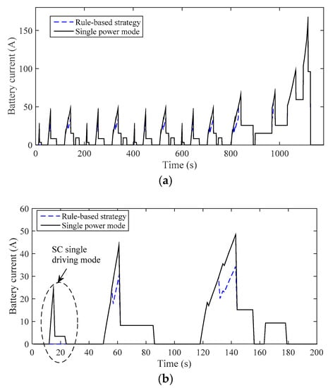 As shown in Figure 15a, rule-based strategy can enter dual driving mode timely, therefore, battery current of rule-based strategy is smaller than battery-only mode. However, rule-based strategy cannot enter dual driving mode under suburban driving condition due to low SC voltage, which can be solved through increasing SC usage, but which will bring cost increase. Furthermore, as shown in Figure 15b, rule-based strategy enters into SC single driving mode concerning high SC voltage and small power demand at about 20s.
