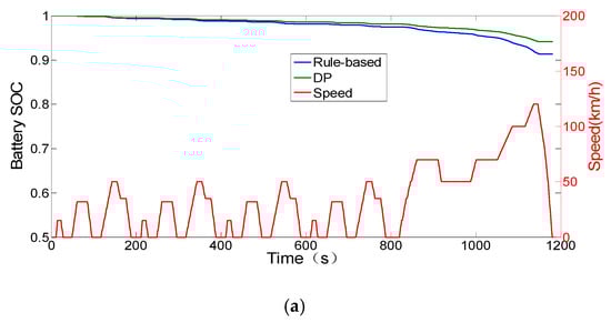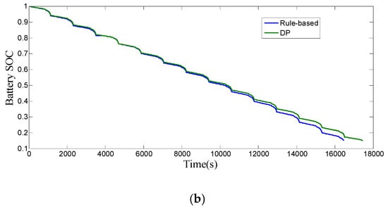 Compared with rule-based energy management control strategy, the effectiveness of the proposed energy optimization strategy based on DP algorithm is verified. The initial SOC was set to 0.95, and the initial SC terminal voltage was 108 V. The main program of the DP algorithm was then run; power system efficiency comparison of DP and rule-based strategy is shown in Figure 16. Compared with rule-based control strategy, the energy optimization control strategy based on DP algorithm has more efficiency optimization space. Figure 16b is a partial enlarged view of the system efficiency of an urban cycle, as shown in Figure 16b, the power system efficiency of DP approach is higher than rule-based strategy as a whole. Besides, Figure 16c is a partial enlarged view of the system efficiency of a suburban cycle, as shown in Figure 16c, concerning the SC is of sufficient electricity, there is a magnificent efficiency increase during the first driving process.