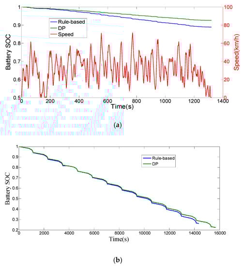 In order to verify the advantages and disadvantages of the two strategies proposed, the initial SOC of the battery is set to 1 and the voltage of the SC is set to 108 V under the NEDC condition and the actual road driving cycle respectively, and the simulation model is set to circulate until the SOC of the battery is reduced to 0.15. Among them, the whole course of the NEDC condition is 11.022 km, and the whole course of the actual road driving cycle is 11.655 km. The SOC change of battery under single NEDC condition is shown in Figure 17a, the SOC change of battery (1–0.15) under multiple NEDC conditions is shown in Figure 17b; and the SOC change of battery under single actual condition is shown in Figure 18a, and the SOC change of battery (1–0.15) under multiple actual conditions is shown in Figure 18b. The speed in Figure 18a is collected from a real vehicle on the campus road surface, which is called the actual road driving cycle. It can be seen from Figure 17 and Figure 18 that compared with the rule-based energy management strategy, the battery SOC of the energy allocation optimization strategy based on the DP algorithm reduces more slowly. That is to say, the energy allocation optimization strategy based on the dynamic programming algorithm is more economical.