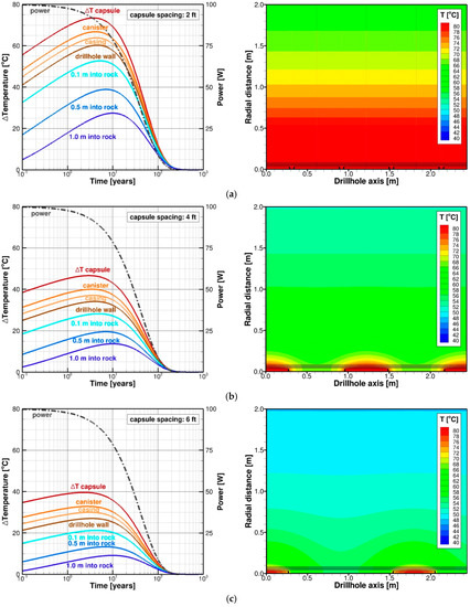 The temperature evolution at various radial distances from the center of the capsule (representing different components of the system) is shown in the left column of Figure 3 for three different capsule spacings; the time-dependent decay-heat power output for one capsule is also shown. The simulated temperature distribution 3 years after the emplacement of heat-generating waste capsules is shown in the right column. As expected, temperatures are higher if waste capsules are emplaced end-to-end with very little separation distance, and maximum temperature changes are reduced if the capsules are spaced farther apart. However, the relative reduction in maximum temperature becomes smaller for larger separation distances, as the heat dissipation regime transitions from cylindrical (Figure 3a) to approximately spherical (Figure 3c). As a result, only small benefits regarding maximum temperature can be gained by spacing capsules by more than about 2 m.