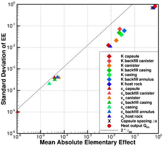 Figure 4 shows a cross-plot between the mean and standard deviation of the absolute elementary effect (EE; Equation (7)) of the Morris global sensitivity analysis. The dashed line represents , where is the standard error of the mean of the elementary effect. All the parameters are below the dashed line, indicating that their non-zero impacts are statistically significant. By far the most influential parameters are the heat output (red circle), the host rock’s thermal conductivity (blue diamond), and the capsule spacing (black X). With the exception of the host rock’s heat capacity (blue triangle), thermal conductivities (diamonds) are considerably more influential than the heat capacities (triangles) for all other components. Properties that are closer to the drillhole axis (hot colors) are less influential than those further out (cool colors), with the exception of the capsule’s heat capacity (red triangle), which influences the maximum temperature of the waste capsule. The parameters also have considerable non-zero standard deviations, indicating that they exhibit interaction effects. This is expected as the temperature is essentially determined by a weighted harmonic average of all thermal diffusivities.